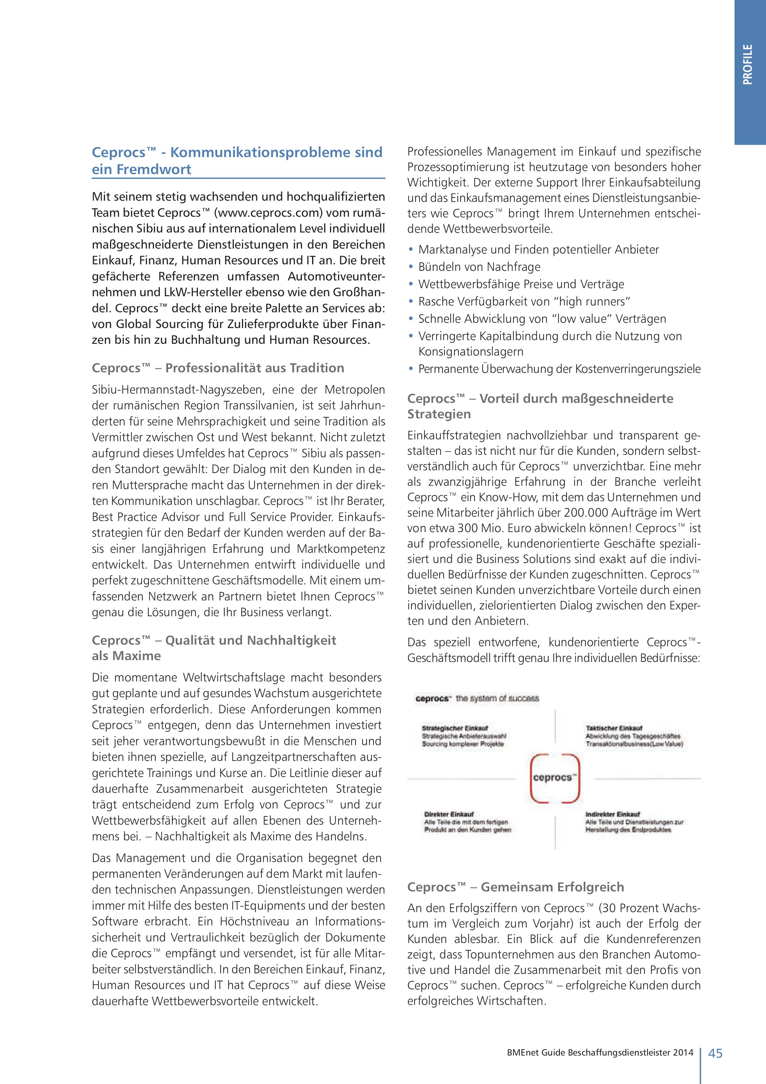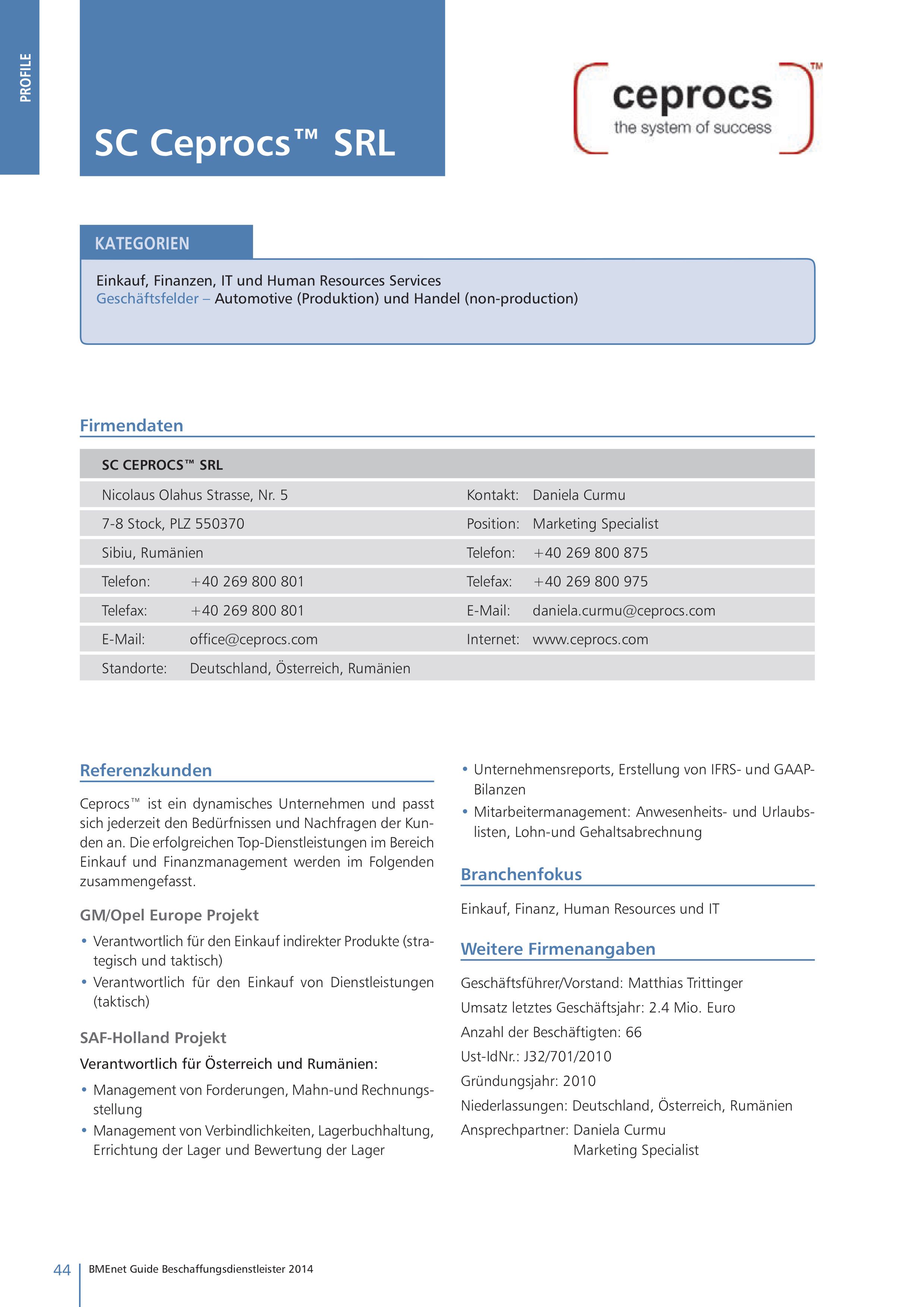Mit seinem stetig wachsenden und hochqualifizierten Team bietet Ceprocs™ (www.ceprocs.com) vom rumä- nischen Sibiu aus auf internationalem Level individuell maßgeschneiderte Dienstleistungen in den Bereichen Einkauf, Finanz, Human Resources und IT an. Die breit gefächerte Referenzen umfassen Automotiveunternehmen und LkW-Hersteller ebenso wie den Großhandel. Ceprocs™ deckt eine breite Palette an Services ab: von Global Sourcing für Zulieferprodukte über Finanzen bis hin zu Buchhaltung und Human Resources.